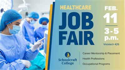 Attention Job Seekers! Schoolcraft College is hosting a Healthcare Career Fair on: February 11 | 3–5 p.m. Vistatech Room 425